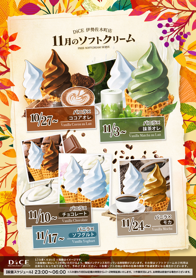 ソフトクリームスケジュール 各店のスケジュールはこちら 札幌駅南口店 札幌狸小路本店 仙台店 大宮店 赤羽店 池袋北口店 池袋西口店 池袋店 新小岩店 渋谷ちとせ会館店 自由が丘店 大井町店 大森店 蒲田駅西口店 雑色店 川崎チネチッタ通店 川崎仲見世通店 溝口店 相模大野モアーズ店 戸塚店 横須賀中央三笠店 大阪道頓堀本店 大阪梅田東通店 12月のソフトクリームスケジュールです > 伊勢佐木町店TOPに戻る 電話 ご予約はこちら ネットカフェダイス ネットカフェ&ダーツ DiCE 伊勢佐木町店 ソフトクリームスケジュール