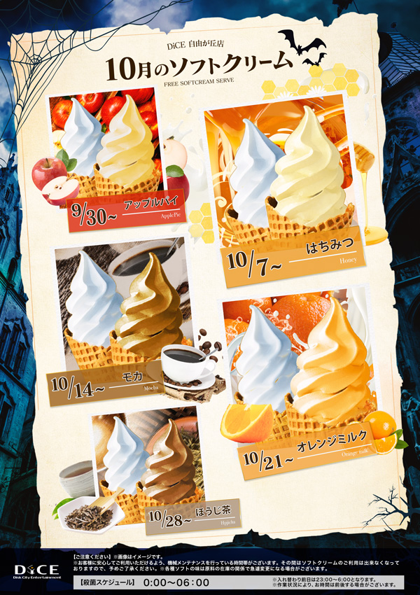 ソフトクリームスケジュール 各店のスケジュールはこちら 札幌駅南口店 札幌狸小路本店 仙台店 大宮店 赤羽店 池袋北口店 池袋西口店 池袋店 新小岩店 渋谷ちとせ会館店 大井町店 大森店 蒲田駅西口店 雑色店 川崎チネチッタ通店 川崎仲見世通店 溝口店 相模大野モアーズ店 伊勢佐木町店 戸塚店 横須賀中央三笠店 大阪道頓堀本店 大阪梅田東通店 11月のソフトクリーム予定表 > 自由が丘店TOPに戻る 電話 ご予約はこちら ネットカフェダイス ネットカフェ&カラオケ DiCE 自由が丘店 ソフトクリームスケジュール