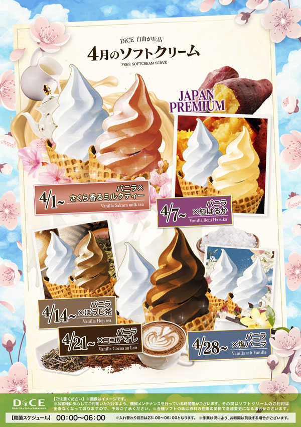 ソフトクリームスケジュール 各店のスケジュールはこちら 札幌駅南口店 札幌狸小路本店 仙台店 大宮店 赤羽店 池袋北口店 池袋西口店 池袋店 新小岩店 渋谷ちとせ会館店 大井町店 大森店 蒲田駅西口店 雑色店 川崎チネチッタ通店 川崎仲見世通店 溝口店 相模大野モアーズ店 伊勢佐木町店 戸塚店 横須賀中央三笠店 大阪道頓堀本店 大阪梅田東通店 4月のソフトクリーム予定表 > 自由が丘店TOPに戻る 電話 ご予約はこちら ネットカフェダイス ネットカフェ&カラオケ DiCE 自由が丘店 ソフトクリームスケジュール