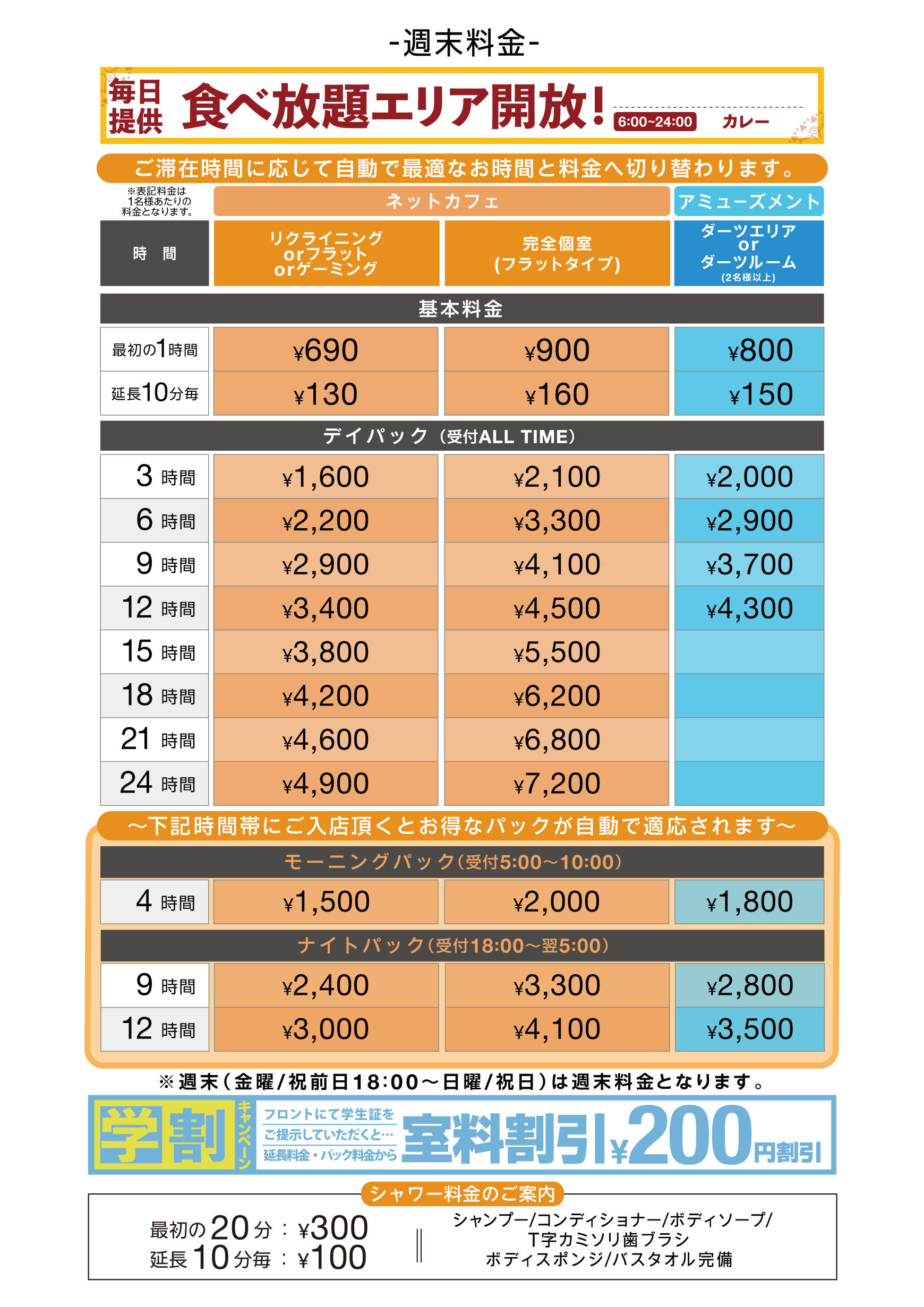 豊富な種類のドリンクや、シャワールーム、プリンターまで、