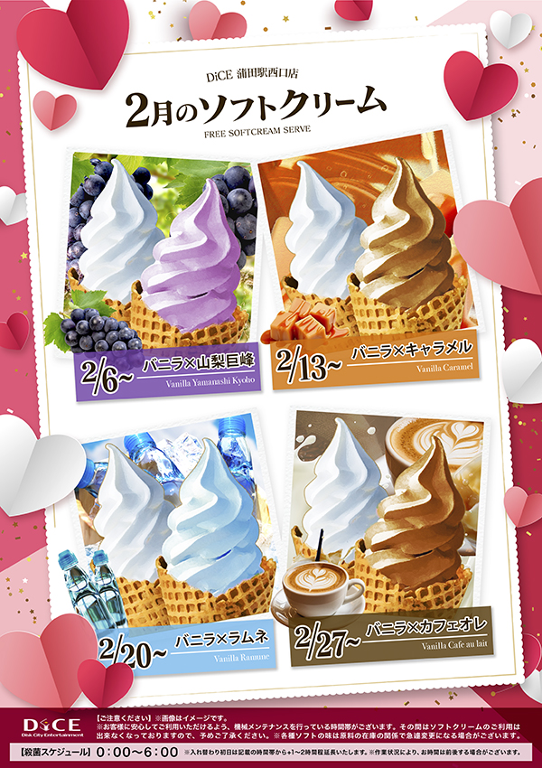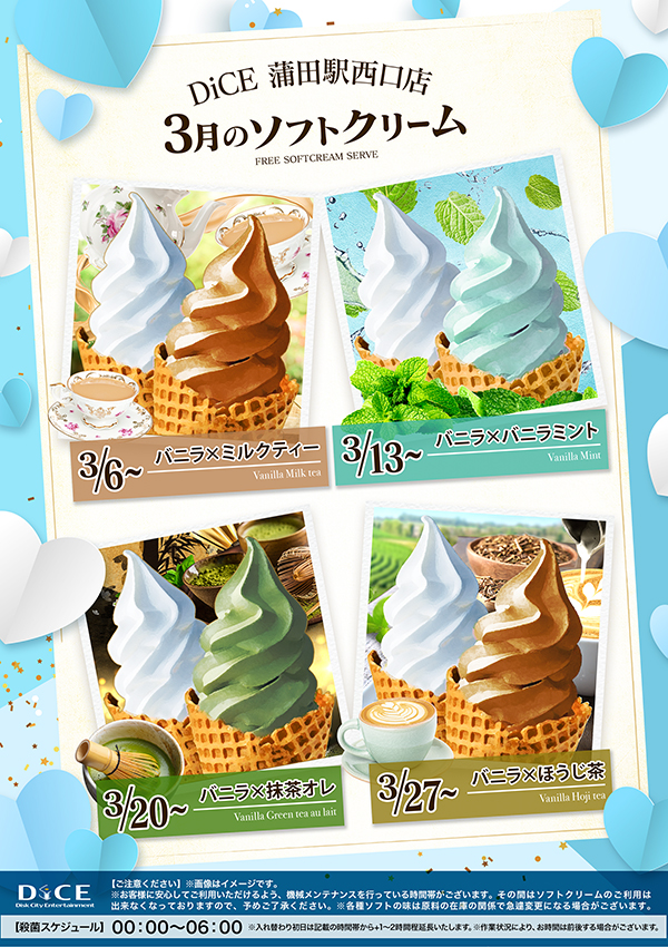 ソフトクリームスケジュール 各店のスケジュールはこちら 札幌駅南口店 札幌狸小路本店 仙台店 大宮店 赤羽店 池袋北口店 池袋西口店 池袋店 新小岩店 渋谷ちとせ会館店 自由が丘店 大井町店 大森店 雑色店 川崎チネチッタ通店 溝口店 相模大野モアーズ店 伊勢佐木町店 戸塚店 横須賀中央三笠店 大阪道頓堀本店 大阪梅田東通店 2月、3月のソフトクリームスケジュールはこちら♪ > 蒲田駅西口店TOPに戻る 電話 ご予約はこちら ネットカフェダイス ネットカフェ&ダーツ DiCE 蒲田駅西口店 ソフトクリームスケジュール