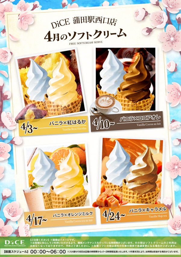 ソフトクリームスケジュール 各店のスケジュールはこちら 札幌駅南口店 札幌狸小路本店 仙台店 大宮店 赤羽店 池袋北口店 池袋西口店 池袋店 新小岩店 渋谷ちとせ会館店 自由が丘店 大井町店 大森店 雑色店 川崎チネチッタ通店 溝口店 相模大野モアーズ店 伊勢佐木町店 戸塚店 横須賀中央三笠店 大阪道頓堀本店 大阪梅田東通店 4月ソフトクリームスケジュールはこちら♪ > 蒲田駅西口店TOPに戻る 電話 ご予約はこちら ネットカフェダイス ネットカフェ&ダーツ DiCE 蒲田駅西口店 ソフトクリームスケジュール
