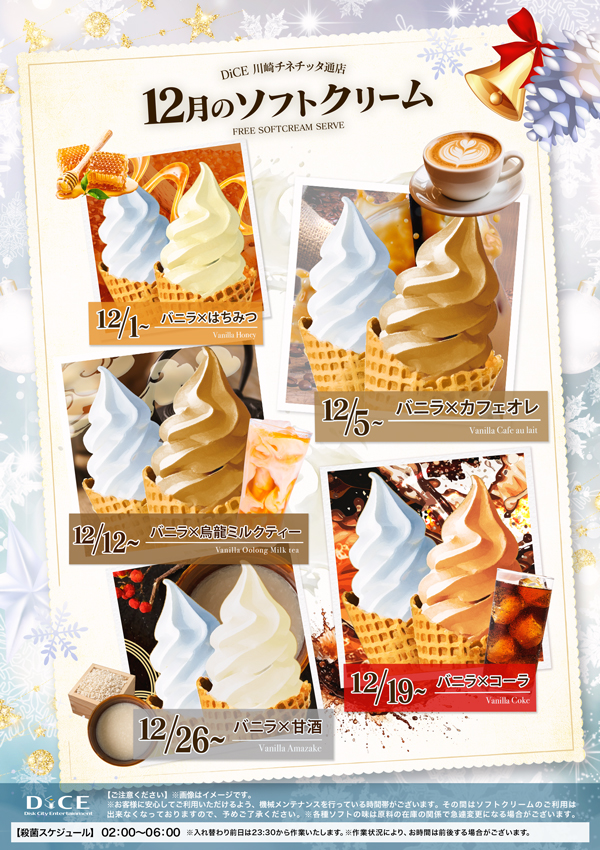 ソフトクリームスケジュール 各店のスケジュールはこちら 札幌駅南口店 札幌狸小路本店 仙台店 大宮店 赤羽店 池袋北口店 池袋西口店 池袋店 新小岩店 渋谷ちとせ会館店 自由が丘店 大井町店 大森店 蒲田駅西口店 雑色店 川崎仲見世通店 溝口店 相模大野モアーズ店 伊勢佐木町店 戸塚店 横須賀中央三笠店 大阪道頓堀本店 大阪梅田東通店 12月ソフトクリーム予定表 > 川崎チネチッタ通店TOPに戻る 電話 ご予約はこちら ネットカフェダイス 完全個室ネットカフェ DiCE 川崎チネチッタ通店 ソフトクリームスケジュール