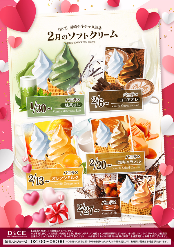 ソフトクリームスケジュール 各店のスケジュールはこちら 札幌駅南口店 札幌狸小路本店 仙台店 大宮店 赤羽店 池袋北口店 池袋西口店 池袋店 新小岩店 渋谷ちとせ会館店 自由が丘店 大井町店 大森店 蒲田駅西口店 雑色店 川崎仲見世通店 溝口店 相模大野モアーズ店 伊勢佐木町店 戸塚店 横須賀中央三笠店 大阪道頓堀本店 大阪梅田東通店 2月ソフトクリーム予定表 > 川崎チネチッタ通店TOPに戻る 電話 ご予約はこちら ネットカフェダイス 完全個室ネットカフェ DiCE 川崎チネチッタ通店 ソフトクリームスケジュール