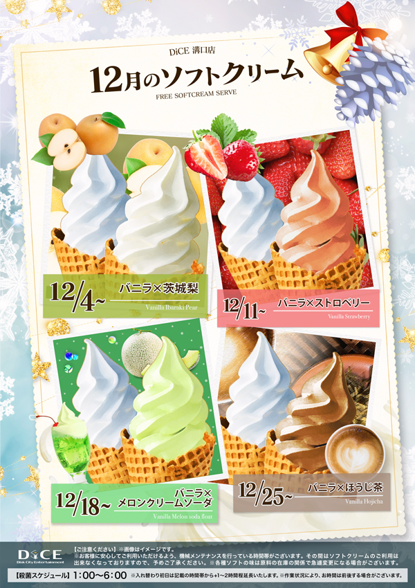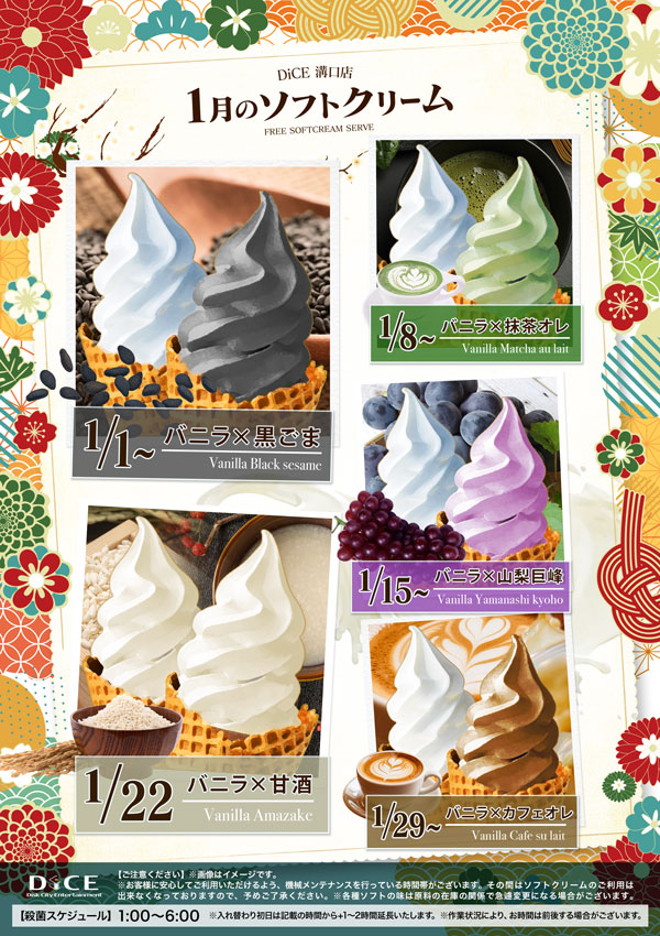 ソフトクリームスケジュール 各店のスケジュールはこちら 札幌駅南口店 札幌狸小路本店 仙台店 大宮店 赤羽店 池袋北口店 池袋西口店 池袋店 新小岩店 渋谷ちとせ会館店 自由が丘店 大井町店 大森店 蒲田駅西口店 雑色店 川崎チネチッタ通店 川崎仲見世通店 相模大野モアーズ店 伊勢佐木町店 戸塚店 横須賀中央三笠店 大阪道頓堀本店 大阪梅田東通店 1月ソフト予定表 > 溝口店TOPに戻る 電話 ご予約はこちら ネットカフェダイス インターネット&マンガ喫茶 DiCE 溝口店 ソフトクリームスケジュール