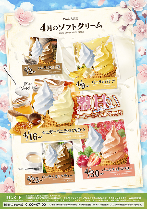 ソフトクリームスケジュール 各店のスケジュールはこちら 札幌駅南口店 札幌狸小路本店 仙台店 赤羽店 池袋北口店 池袋西口店 池袋店 新小岩店 渋谷ちとせ会館店 自由が丘店 大井町店 大森店 蒲田駅西口店 雑色店 川崎チネチッタ通店 川崎仲見世通店 溝口店 相模大野モアーズ店 伊勢佐木町店 戸塚店 横須賀中央三笠店 大阪道頓堀本店 大阪梅田東通店 26年4月度ソフトクリーム予定表 > 大宮店TOPに戻る 電話 ご予約はこちら ネットカフェダイス ネットカフェ&カラオケ DiCE 大宮店 ソフトクリームスケジュール