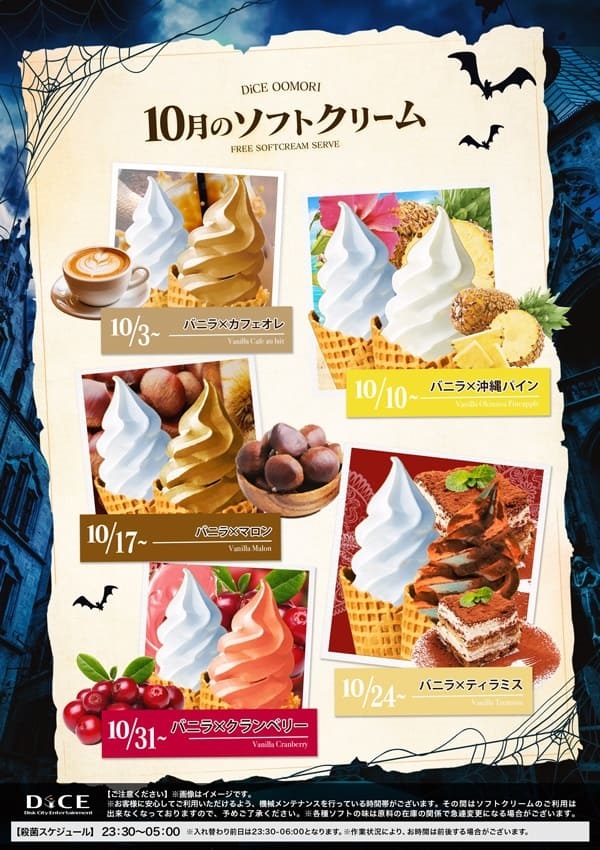 ソフトクリームスケジュール 各店のスケジュールはこちら 札幌駅南口店 札幌狸小路本店 仙台店 大宮店 赤羽店 池袋北口店 池袋西口店 池袋店 新小岩店 渋谷ちとせ会館店 自由が丘店 大井町店 蒲田駅西口店 雑色店 川崎チネチッタ通店 川崎仲見世通店 溝口店 相模大野モアーズ店 伊勢佐木町店 戸塚店 横須賀中央三笠店 大阪道頓堀本店 大阪梅田東通店 10月度ソフト予定表 > 大森店TOPに戻る 電話 ご予約はこちら ネットカフェダイス インターネット&マンガ喫茶 DiCE 大森店 ソフトクリームスケジュール