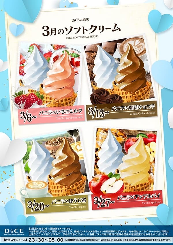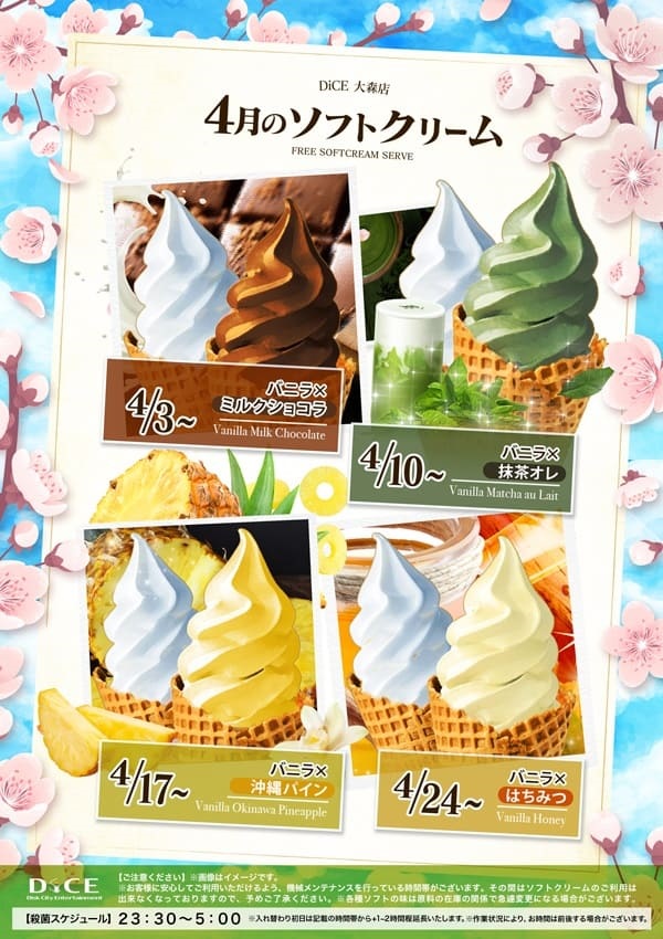 ソフトクリームスケジュール 各店のスケジュールはこちら 札幌駅南口店 札幌狸小路本店 仙台店 大宮店 赤羽店 池袋北口店 池袋西口店 池袋店 新小岩店 渋谷ちとせ会館店 自由が丘店 大井町店 蒲田駅西口店 雑色店 川崎チネチッタ通店 川崎仲見世通店 溝口店 相模大野モアーズ店 伊勢佐木町店 戸塚店 横須賀中央三笠店 大阪道頓堀本店 大阪梅田東通店 3・4月ソフト予定表 > 大森店TOPに戻る 電話 ご予約はこちら ネットカフェダイス インターネット&マンガ喫茶 DiCE 大森店 ソフトクリームスケジュール