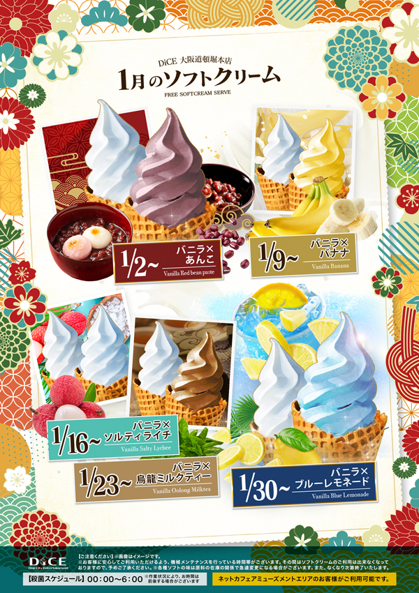 ソフトクリームスケジュール 各店のスケジュールはこちら 札幌駅南口店 仙台店 大宮店 赤羽店 池袋北口店 池袋西口店 池袋店 新小岩店 渋谷ちとせ会館店 自由が丘店 大井町店 大森店 蒲田駅西口店 雑色店 川崎チネチッタ通店 川崎仲見世通店 溝口店 相模大野モアーズ店 伊勢佐木町店 戸塚店 横須賀中央三笠店 大阪梅田東通店 1月のソフトクリーム予定表 >大阪道頓堀本店TOPに戻る 電話 ご予約はこちら ネットカフェダイス ネットカフェ&カラオケ DiCE 大阪道頓堀本店 ソフトクリームスケジュール