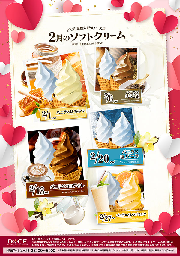 ソフトクリームスケジュール 各店のスケジュールはこちら 札幌駅南口店 札幌狸小路本店 仙台店 大宮店 赤羽店 池袋北口店 池袋西口店 池袋店 新小岩店 渋谷ちとせ会館店 自由が丘店 大井町店 大森店 蒲田駅西口店 雑色店 川崎チネチッタ通店 川崎仲見世通店 溝口店 伊勢佐木町店 戸塚店 横須賀中央三笠店 大阪道頓堀本店 大阪梅田東通店 2月ソフトクリーム 予定 > 相模大野モアーズ店TOPに戻る 電話 ご予約はこちら ネットカフェダイス インターネット&マンガ喫茶 DiCE 相模大野モアーズ店 ソフトクリームスケジュール