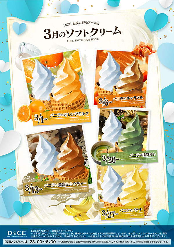 ソフトクリームスケジュール 各店のスケジュールはこちら 札幌駅南口店 札幌狸小路本店 仙台店 大宮店 赤羽店 池袋北口店 池袋西口店 池袋店 新小岩店 渋谷ちとせ会館店 自由が丘店 大井町店 大森店 蒲田駅西口店 雑色店 川崎チネチッタ通店 川崎仲見世通店 溝口店 伊勢佐木町店 戸塚店 横須賀中央三笠店 大阪道頓堀本店 大阪梅田東通店 3月ソフトクリーム予定 > 相模大野モアーズ店TOPに戻る 電話 ご予約はこちら ネットカフェダイス インターネット&マンガ喫茶 DiCE 相模大野モアーズ店 ソフトクリームスケジュール