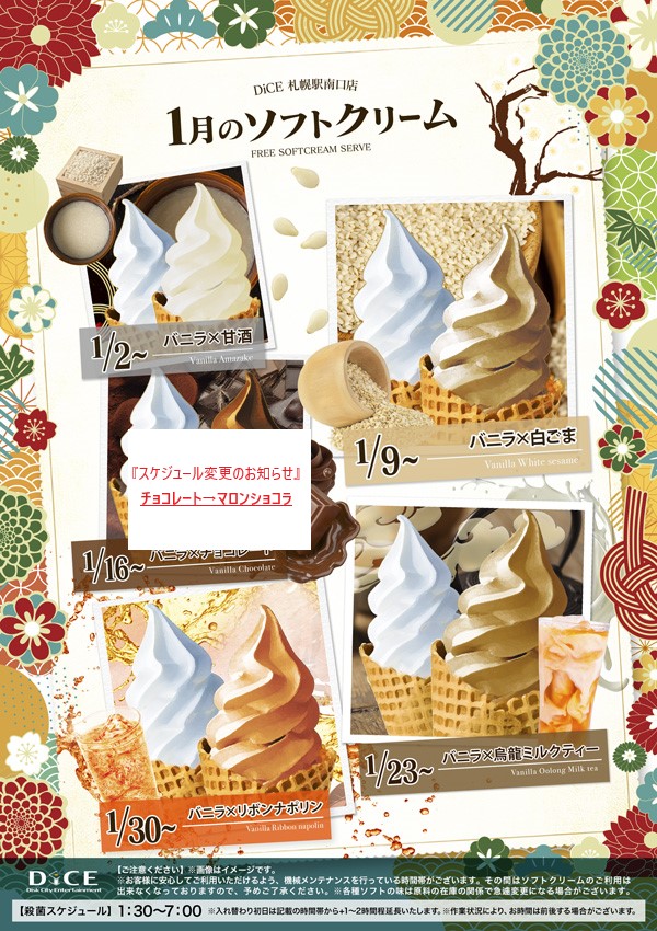 ソフトクリームスケジュール 各店のスケジュールはこちら 札幌狸小路本店 仙台店 大宮店 赤羽店 池袋北口店 池袋西口店 池袋店 新小岩店 渋谷ちとせ会館店 自由が丘店 大井町店 大森店 蒲田駅西口店 雑色店 川崎チネチッタ通店 川崎仲見世通店 溝口店 相模大野モアーズ店 伊勢佐木町店 戸塚店 横須賀中央三笠店 大阪道頓堀本店 大阪梅田東通店 2月度ソフトクリーム予定表 > 札幌駅南口店TOPに戻る 電話 ご予約はこちら ネットカフェダイス ネットカフェ&マンガ喫茶 DiCE 札幌駅南口店 ソフトクリームスケジュール