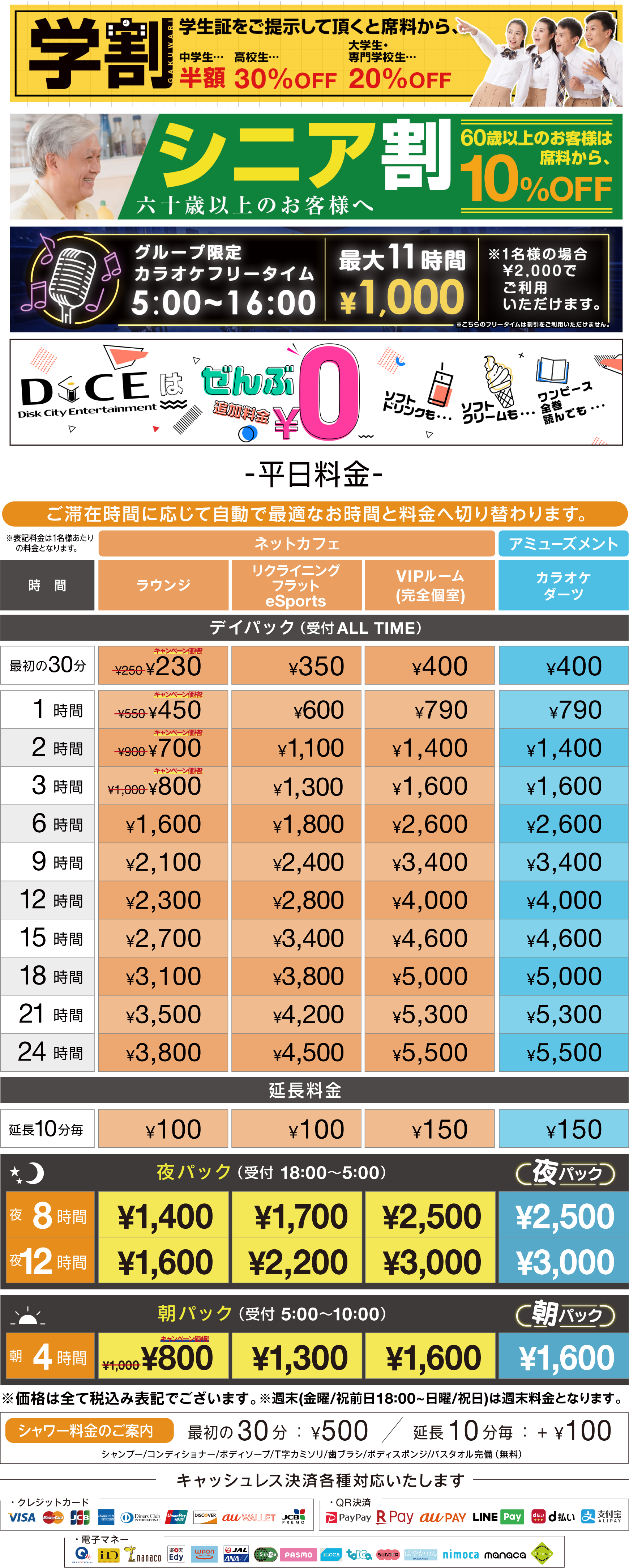 30分間500円(シャワーのみご利用の場合30分750円〜)でご利用いただけます。