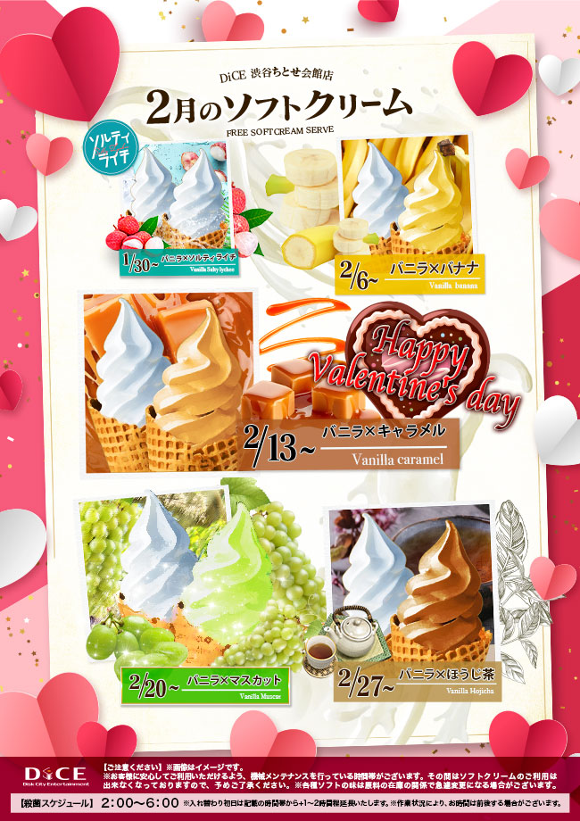 ソフトクリームスケジュール 各店のスケジュールはこちら 札幌駅南口店 札幌狸小路本店 仙台店 大宮店 赤羽店 池袋北口店 池袋西口店 池袋店 新小岩店 自由が丘店 大井町店 大森店 蒲田駅西口店 雑色店 川崎チネチッタ通店 川崎仲見世通店 溝口店 相模大野モアーズ店 伊勢佐木町店 戸塚店 横須賀中央三笠店 大阪道頓堀本店 大阪梅田東通店 1.2月のソフトクリーム予定表♩ > 渋谷ちとせ会館店TOPに戻る 電話 ご予約はこちら ネットカフェダイス 完全個室ネットカフェ DiCE 渋谷ちとせ会館店 ソフトクリームスケジュール