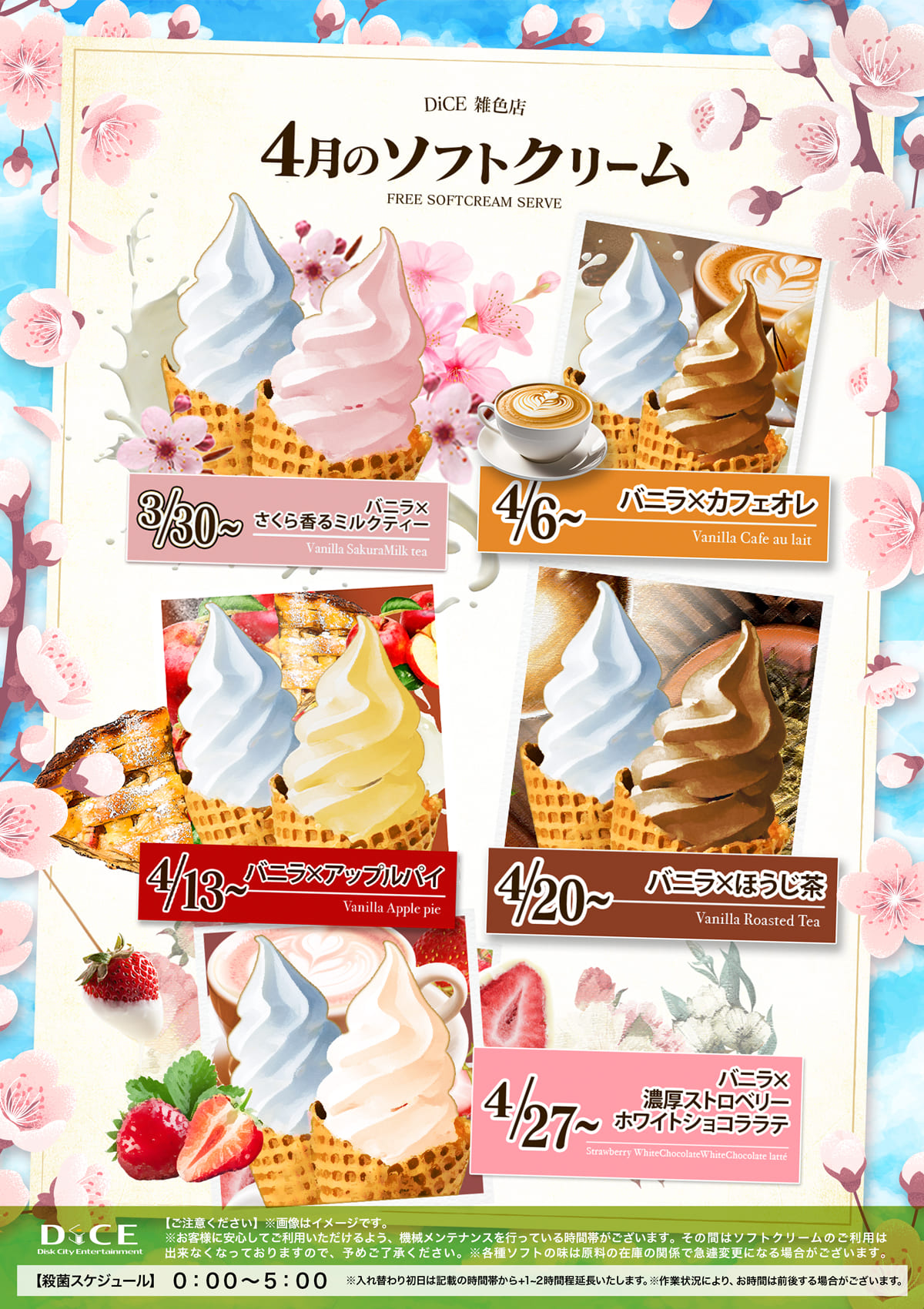 ソフトクリームスケジュール 各店のスケジュールはこちら 札幌駅南口店 札幌狸小路本店 仙台店 大宮店 赤羽店 池袋北口店 池袋西口店 池袋店 新小岩店 渋谷ちとせ会館店 自由が丘店 大井町店 大森店 蒲田駅西口店 川崎チネチッタ通店 川崎仲見世通店 溝口店 相模大野モアーズ店 伊勢佐木町店 戸塚店 横須賀中央三笠店 大阪道頓堀本店 大阪梅田東通店 4月度ソフトクリーム予定表 > 雑色店TOPに戻る 電話 ご予約はこちら ネットカフェダイス ネットカフェ&マンガ喫茶 DiCE 雑色店 ソフトクリームスケジュール