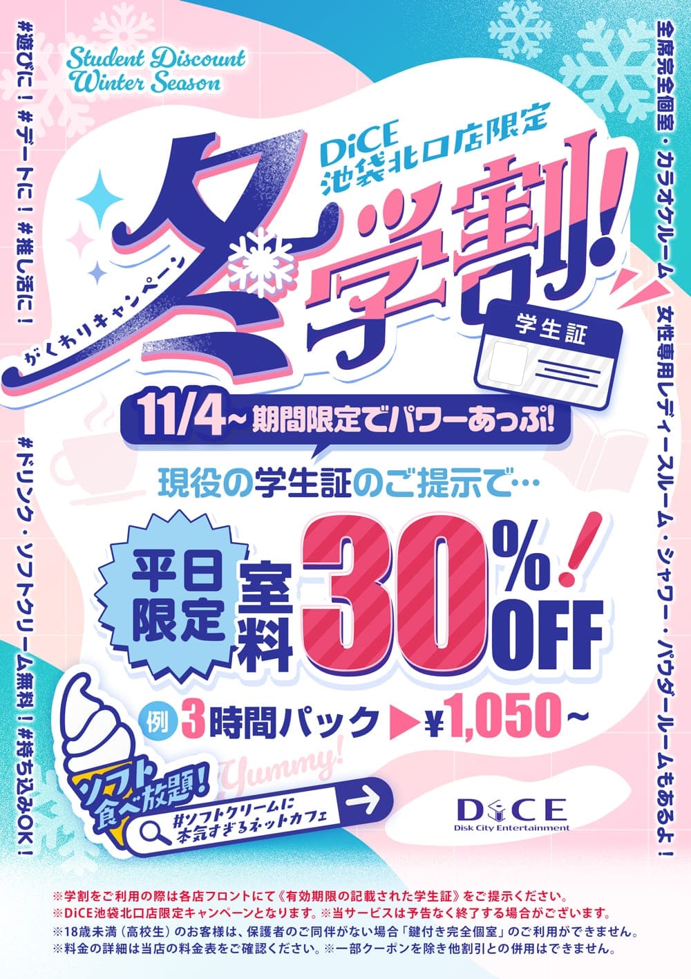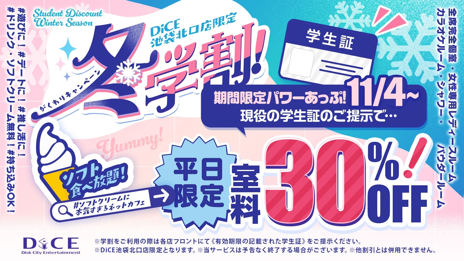 ニュース お知らせ 2025.10.15 【11月スタート】学割が期間限定で30%OFFにパワーアップ!【平日限定】 > ニュース一覧に戻る 電話 ご予約はこちら ネットカフェダイス ネットカフェ&カラオケ DiCE 池袋北口店 ニュース 【11月スタート】学割が期間限定で30%OFFにパワーアップ!【平日限定】