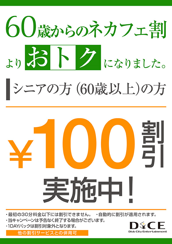 ニュース キャンペーン 2025.01.26 シニア割実施中。60歳以上のお客様は自動的に100円割引! > ニュース一覧に戻る 電話 ご予約はこちら ネットカフェダイス インターネット&マンガ喫茶 DiCE 溝口店 ニュース シニア割実施中。60歳以上のお客様は自動的に100円割引!