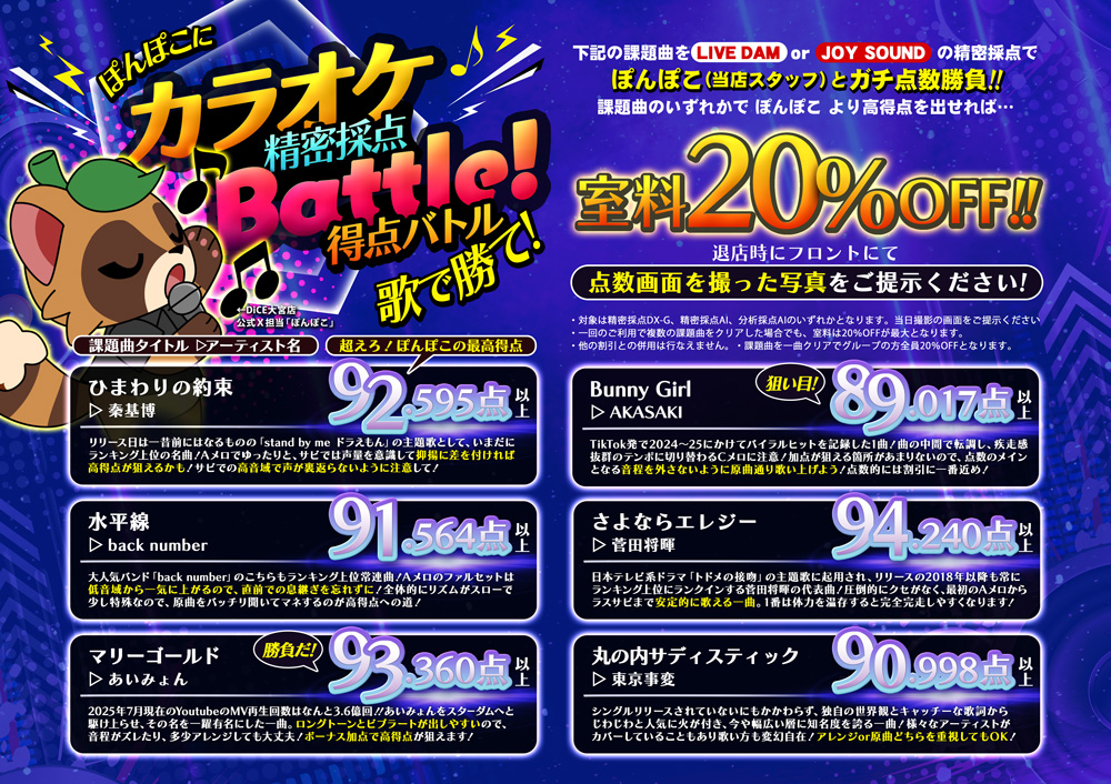 ニュース キャンペーン 2025.08.05 【ぽんぽこに勝て!】カラオケバトル実施中! > ニュース一覧に戻る 電話 ご予約はこちら ネットカフェダイス インターネット&マンガ喫茶 DiCE 大宮店 ニュース 【ぽんぽこに勝て!】カラオケバトル実施中!