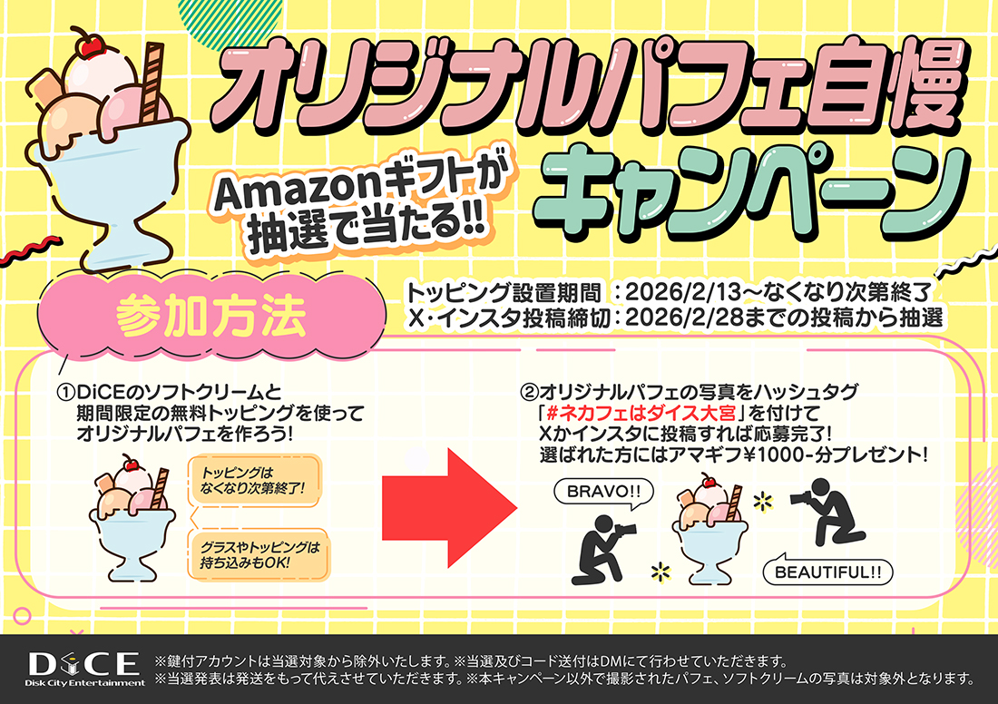 ニュース キャンペーン 2026.02.13 アマギフが当たる!?『パフェ自慢キャンペーン』開催! > ニュース一覧に戻る 電話 ご予約はこちら ネットカフェダイス インターネット&マンガ喫茶 DiCE 大宮店 ニュース アマギフが当たる!?『パフェ自慢キャンペーン』開催!