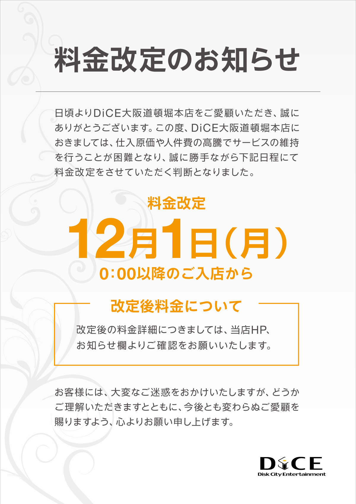 ニュース お知らせ 2025.11.27 【料金改定のお知らせ】 > ニュース一覧に戻る 電話 ご予約はこちら ネットカフェダイス ネットカフェ&カラオケ DiCE 大阪道頓堀本店 ニュース 【料金改定のお知らせ】