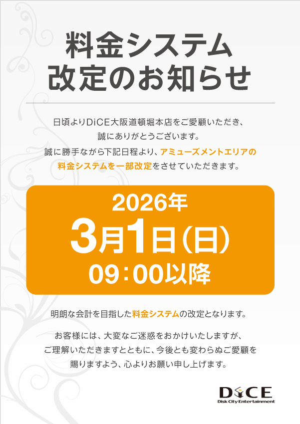 ニュース お知らせ 2026.02.24 【料金システム】変更のお知らせ > ニュース一覧に戻る 電話 ご予約はこちら ネットカフェダイス ネットカフェ&カラオケ DiCE 大阪道頓堀本店 ニュース 【料金システム】変更のお知らせ