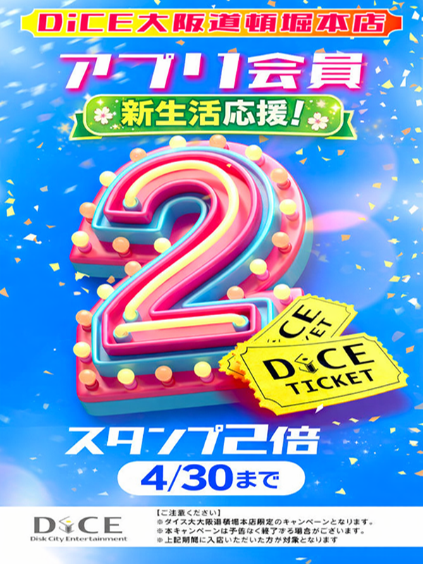 ニュース キャンペーン 2026.04.08 【新生活応援】アプリ会員 スタンプ2倍 > ニュース一覧に戻る 電話 ご予約はこちら ネットカフェダイス ネットカフェ&カラオケ DiCE 大阪道頓堀本店 ニュース 【新生活応援】アプリ会員 スタンプ2倍