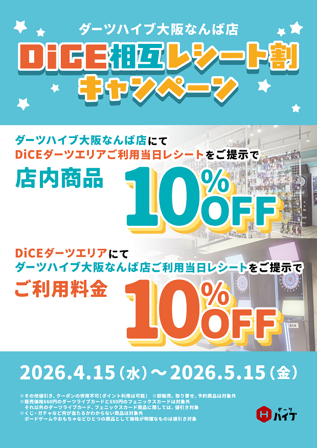 【ダーツハイブ大阪なんば店×DiCE大阪道頓堀本店 相互レシート割キャンペーン!】