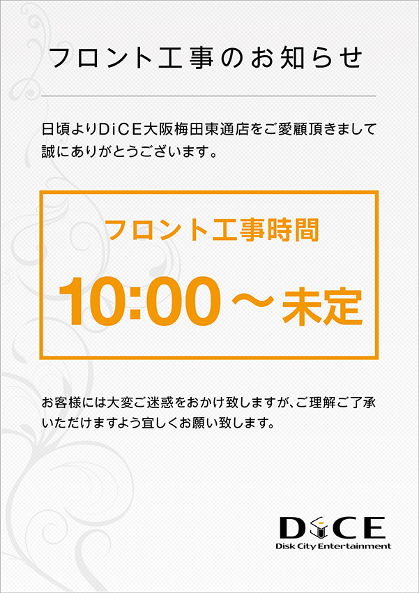 ニュース お知らせ 2025.10.09 10月14日 フロント工事のお知らせ > ニュース一覧に戻る 電話 ご予約はこちら ネットカフェダイス 完全個室ネットカフェ DiCE 大阪梅田東通店 ニュース 10月14日 フロント工事のお知らせ