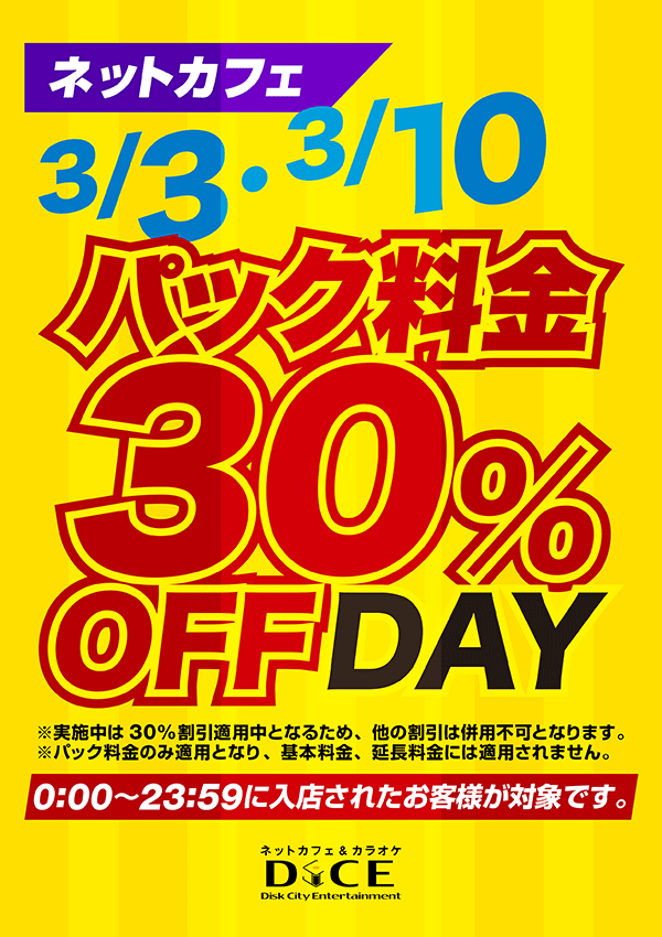 ニュース キャンペーン 2026.02.25 火曜パック料金30%OFF! > ニュース一覧に戻る 電話 ご予約はこちら ネットカフェダイス 完全個室ネットカフェ DiCE 大阪梅田東通店 ニュース 火曜パック料金30%OFF!