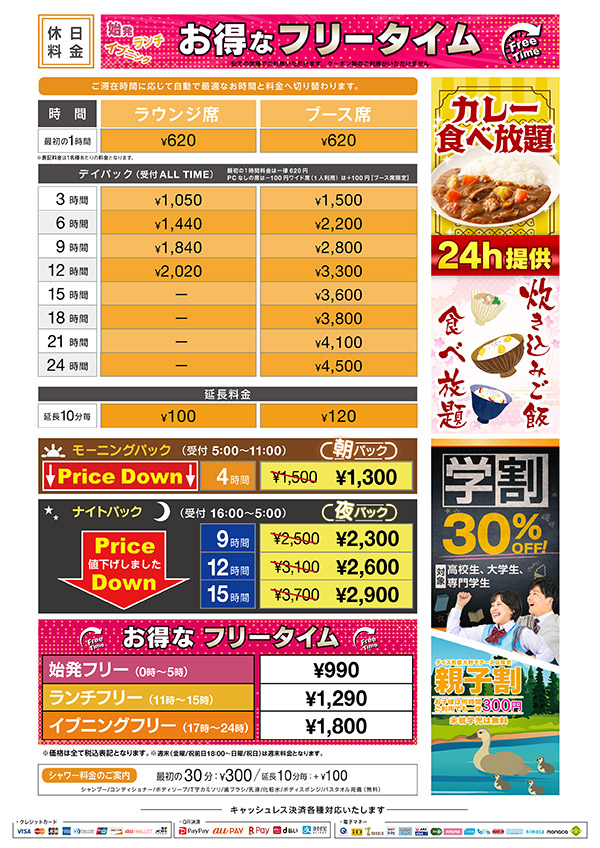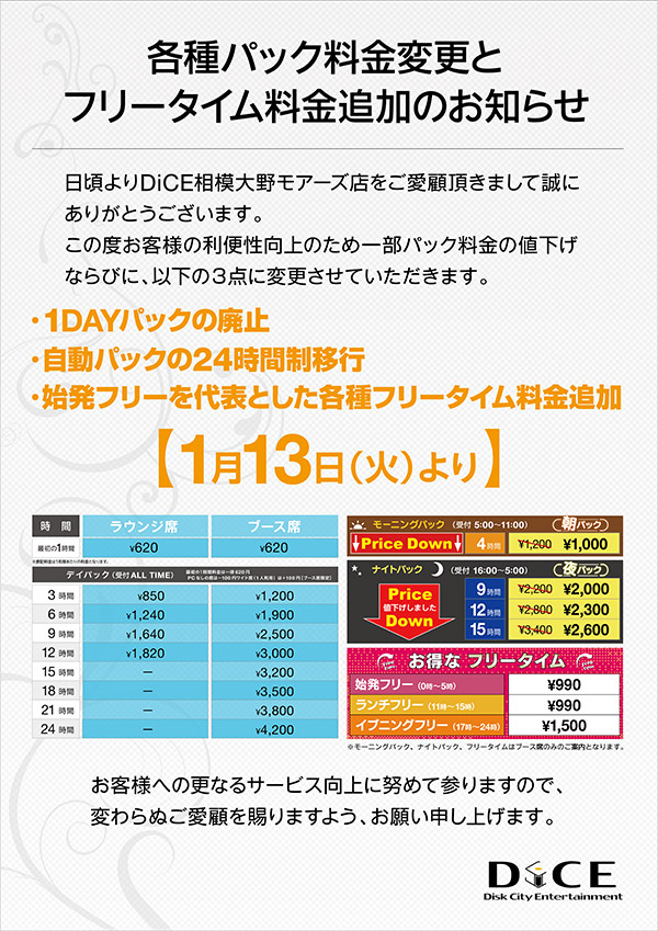 ニュース お知らせ 2026.01.10 【料金改定のお知らせ】 > ニュース一覧に戻る 電話 ご予約はこちら ネットカフェダイス インターネット&マンガ喫茶 DiCE 相模大野モアーズ店 ニュース 【料金改定のお知らせ】