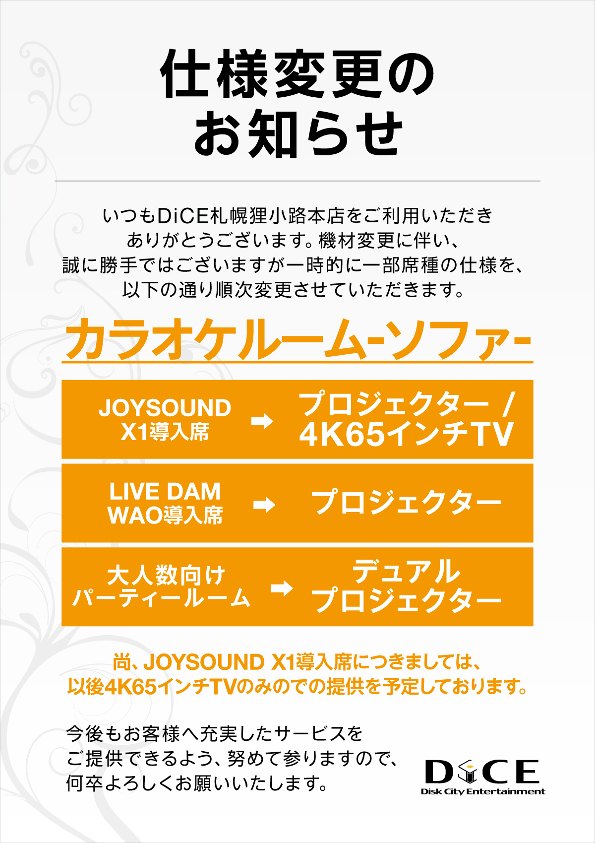 お知らせ 2025.12.05 【カラオケ】設備変更のお知らせ 日頃よりご利用いただきありがとうございます。機材変更に伴い以下の通り室内の設備を変更させていただきます。ご理解のほどよろしくお願いいたします。 > ニュース一覧に戻る