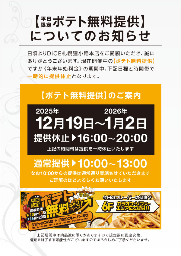 ニュース お知らせ 2025.12.19 【お知らせ】~冬季料金中の無料ポテトについて~ > ニュース一覧に戻る 電話 ご予約はこちら ネットカフェダイス ネットカフェ&カラオケ DiCE 札幌狸小路本店 ニュース 【お知らせ】~冬季料金中の無料ポテトについて~