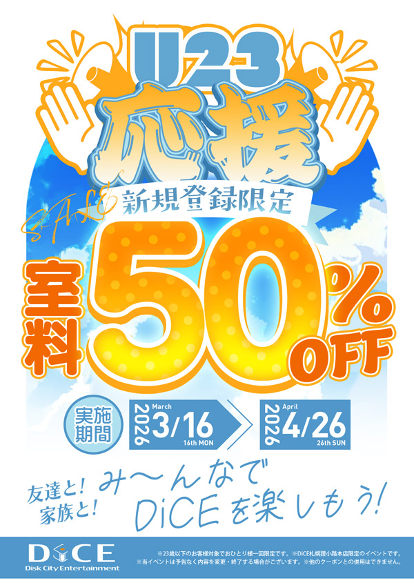 ニュース キャンペーン 2026.03.13 新生活応援♪U23新規室料半額キャンペーン!! > ニュース一覧に戻る 電話 ご予約はこちら ネットカフェダイス ネットカフェ&カラオケ DiCE 札幌狸小路本店 ニュース 新生活応援♪U23新規室料半額キャンペーン!!