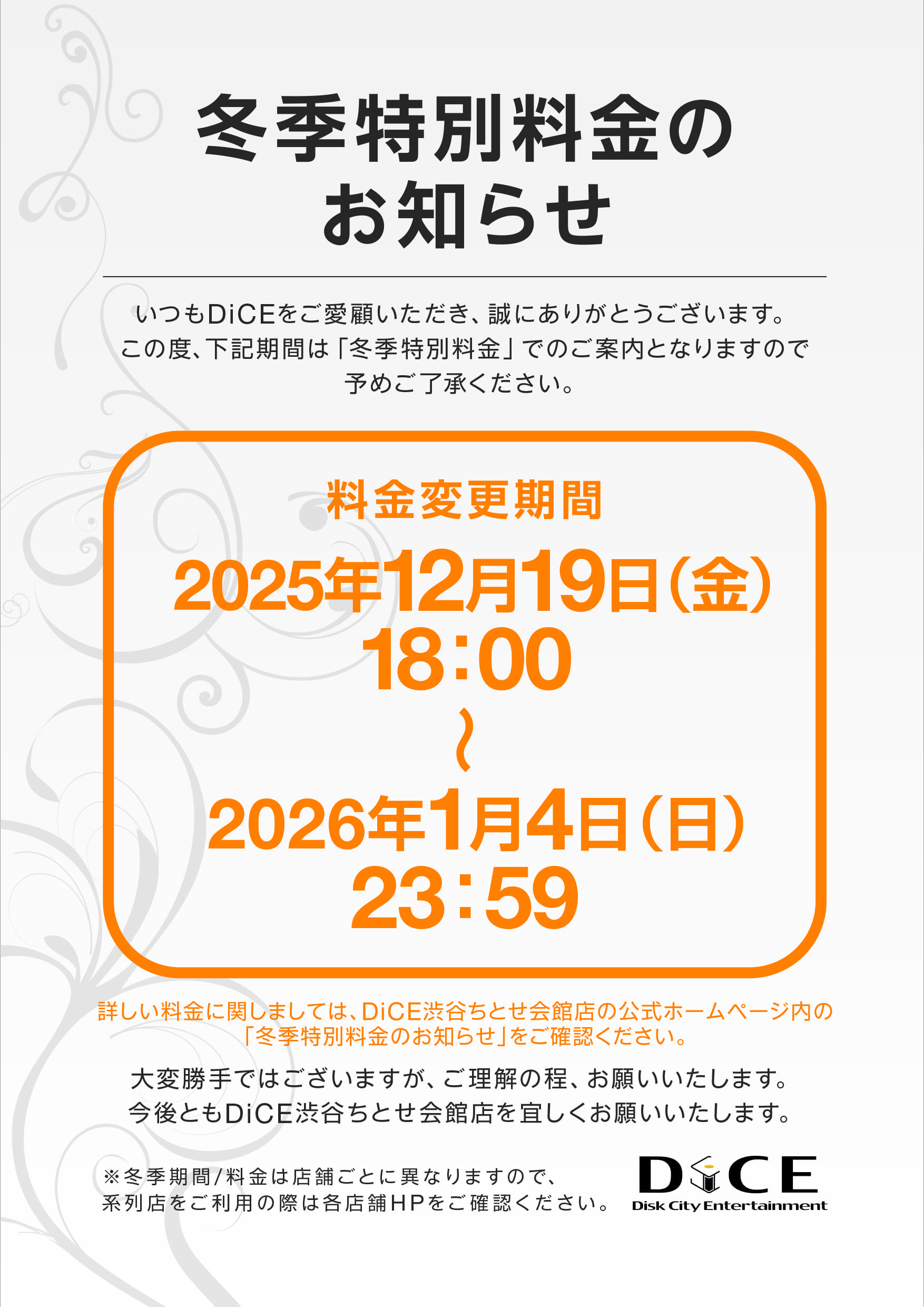 ニュース お知らせ 2025.12.15 冬季特別料金のお知らせ ----------------------------------------------【冬季特別料金期間中の料金はこちら↓】 > ニュース一覧に戻る 電話 ご予約はこちら ネットカフェダイス インターネット&マンガ喫茶 DiCE 渋谷ちとせ会館店 ニュース 冬季特別料金のお知らせ