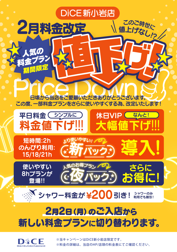 ニュース お知らせ 2026.01.24 料金改定のご案内 2/2から新たな料金パックも増えてリニューアルします! > ニュース一覧に戻る 電話 ご予約はこちら ネットカフェダイス インターネット&マンガ喫茶 DiCE 新小岩店 ニュース 料金改定のご案内