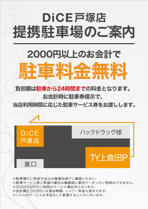 ニュース お知らせ 2024.12.29 駐車場提携サービスのご案内 > ニュース一覧に戻る 電話 ご予約はこちら ネットカフェダイス インターネット&マンガ喫茶 DiCE 戸塚店 ニュース 駐車場提携サービスのご案内