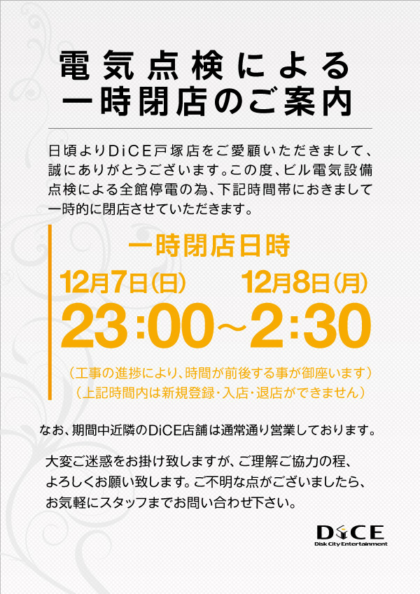 お知らせ 2025.12.02 全館電気点検による一時閉店のお知らせ 工事の進捗次第で開店時間が前後することがございます。当日の最新情報はDiCE戸塚店 X(@DiCE‗TOK)をご確認ください。 > ニュース一覧に戻る