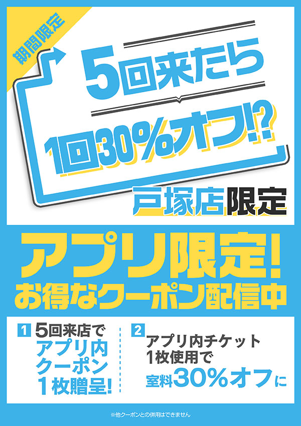 ニュース キャンペーン 2026.03.01 戸塚店限定、5回に1回室料30%オフ!クーポン配布中! > ニュース一覧に戻る 電話 ご予約はこちら ネットカフェダイス インターネット&マンガ喫茶 DiCE 戸塚店 ニュース 戸塚店限定、5回に1回室料30%オフ!クーポン配布中!