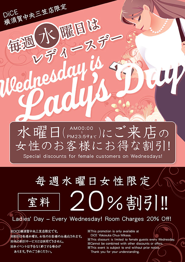 ニュース お知らせ 2025.08.20 毎週水曜日はレディースデー♪ > ニュース一覧に戻る 電話 ご予約はこちら ネットカフェダイス インターネット&マンガ喫茶 DiCE 横須賀中央三笠店 ニュース 毎週水曜日はレディースデー♪